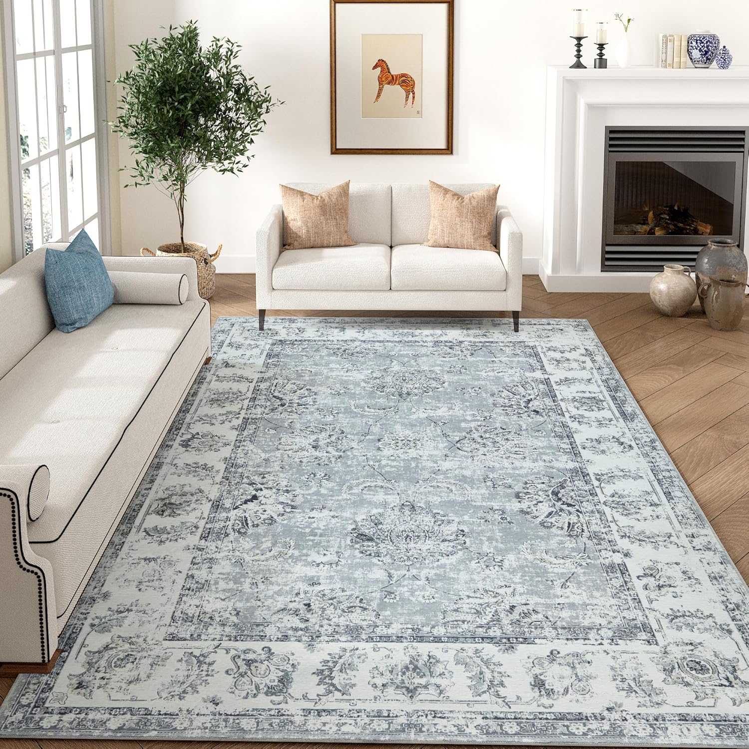 jinchan Washable Area Rug 8x10 for Living Room Soft Faux Wool Ultra-Thin Stain Resistant Non-Slip Distressed Vintage Floral Large Carpet for Bedroom,Dining Room,Home Office,Nursery(Grey, 8'x10')