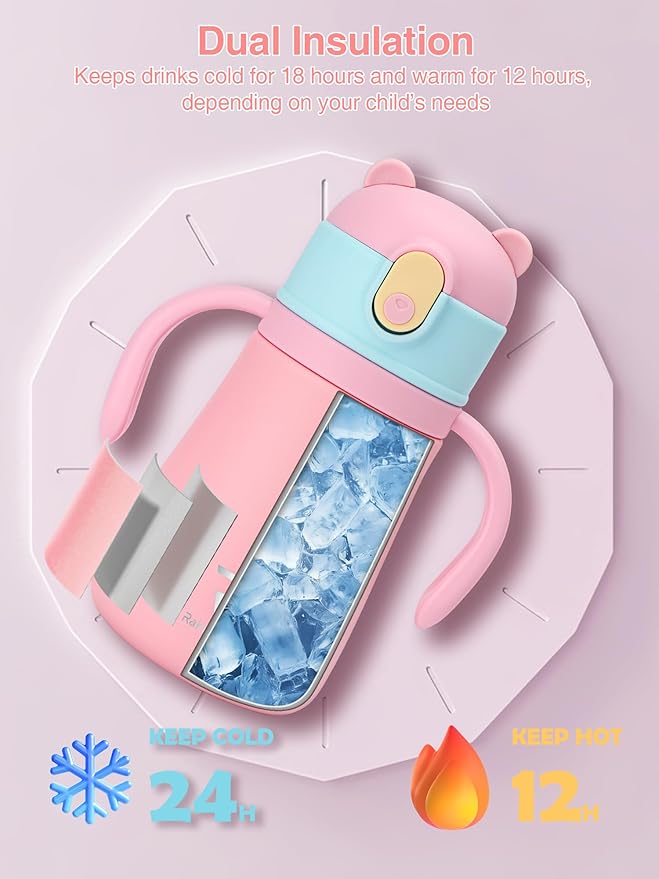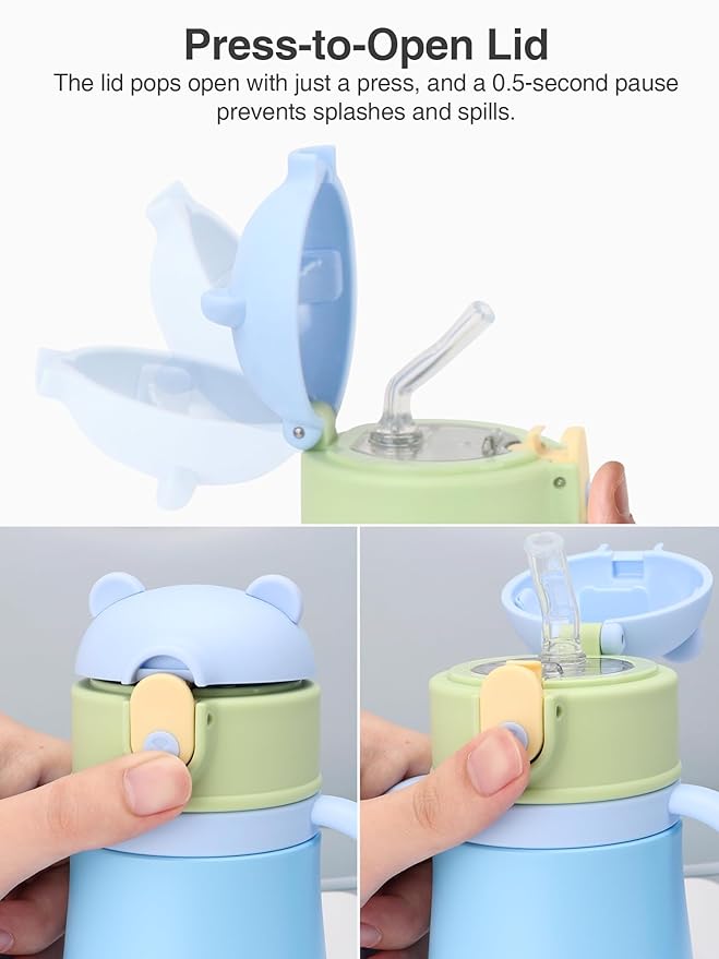 12oz Kids Insulated Water Bottle Double-Wall Vacuum Kids Water Bottle with Hygiene Silicone Straw Blowout-Proof Lid Insulated No BPA Durable Stainless Steel