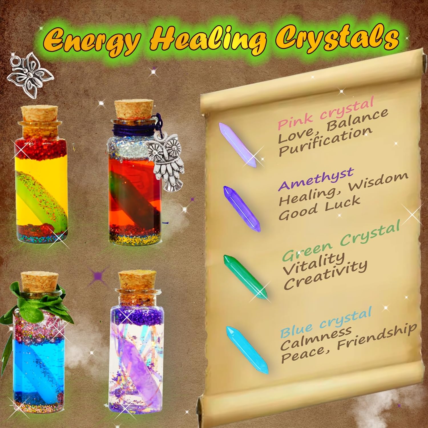 - Crystals Potion Set: use your imagination and creativity to mix unicorns, fairy glitter dust, healing crystals, spiders, fairy wings and other magical ingredients to customise your own potion recipes