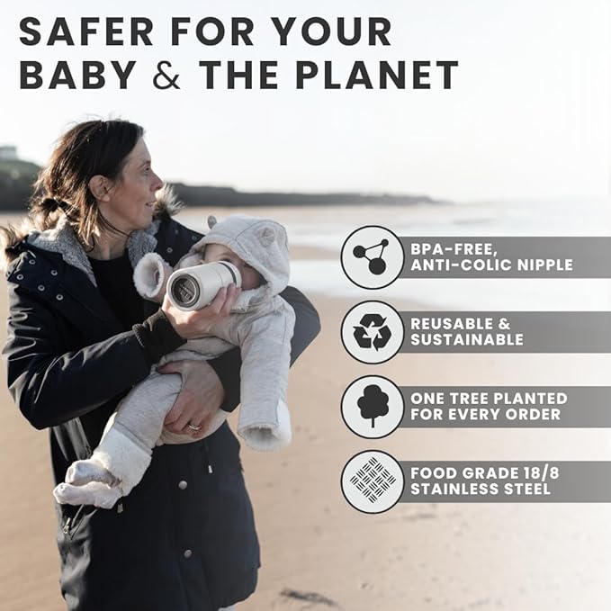 - ECO-FRIENDLY & SAFE FOR YOUR BABY - Our bottle is made from food-grade 18/8 stainless steel and features a BPA free, PVA free, and toxin-free nipple, ensuring the utmost safety for your baby. We use recyclable packaging and support reforestation by planting one tree for every product.
