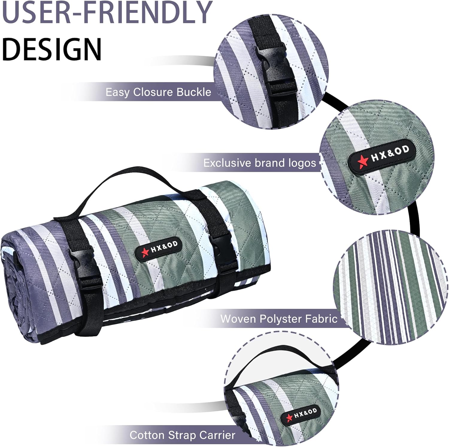 HX&OD Outdoor Picnic Blanket Extra Large, 80''*80' Waterproof Picnic Mat with Stakes Foldable Camping Blanket Portable with Carry Strap for Beach Mat (Green, 80''*80'')