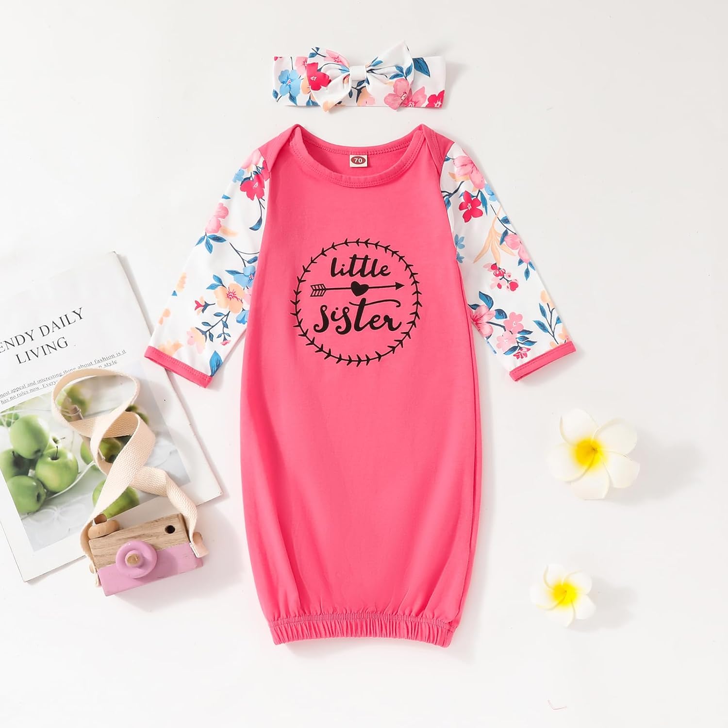 - Cute baby nightgown: "Little Sister" letter print, vintage floral long sleeve design, matching bowknot headband, super fashionable 2pcs baby sleep gown baby pajamas in spring summer fall winter.