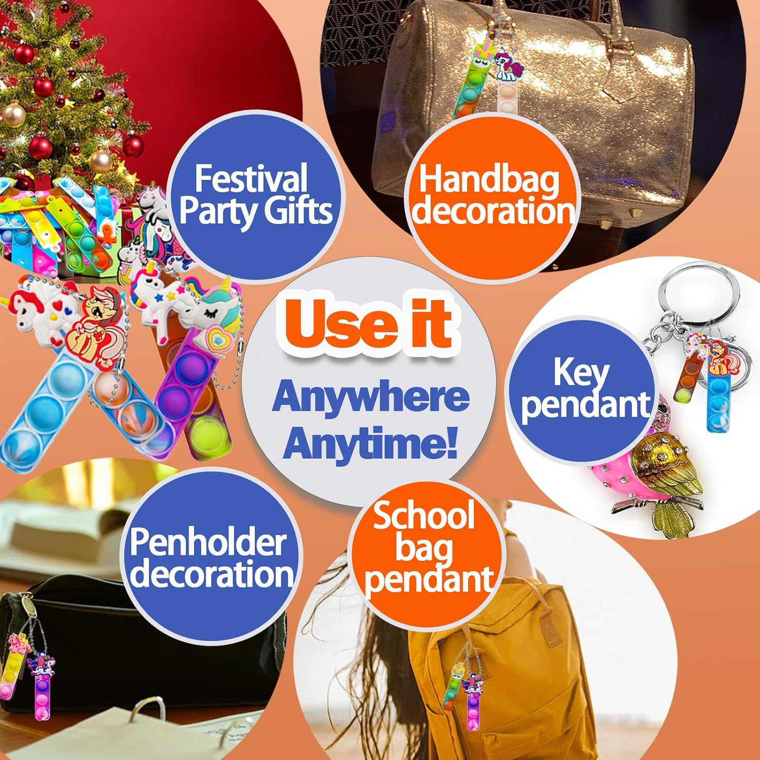 - Easy to carry: Our push pop fidget toys are small and cute, and can be used as decorations hanging on school bags, keys, pencil cases, handbags, etc. . You can relieve anxiety by stretching, rotating and squeezing bubbles anytime and anywhere when you feel stressed. Suitable for children and adults