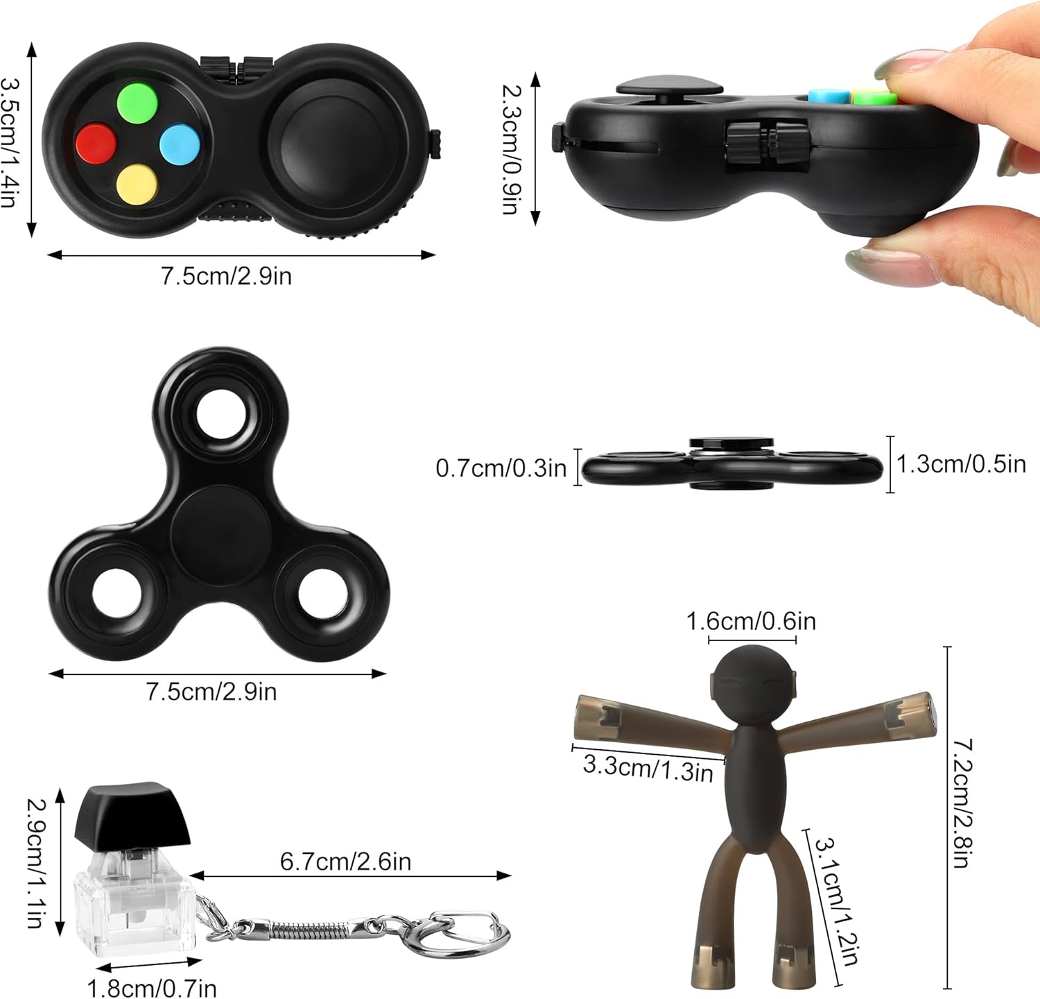 - Fidget Toy Pack - This fidgets pack including 1pc fidget spinner, 1pc fidget pad, 1pc keyboard fidget keychain, 3 pcs fridge magnet men
