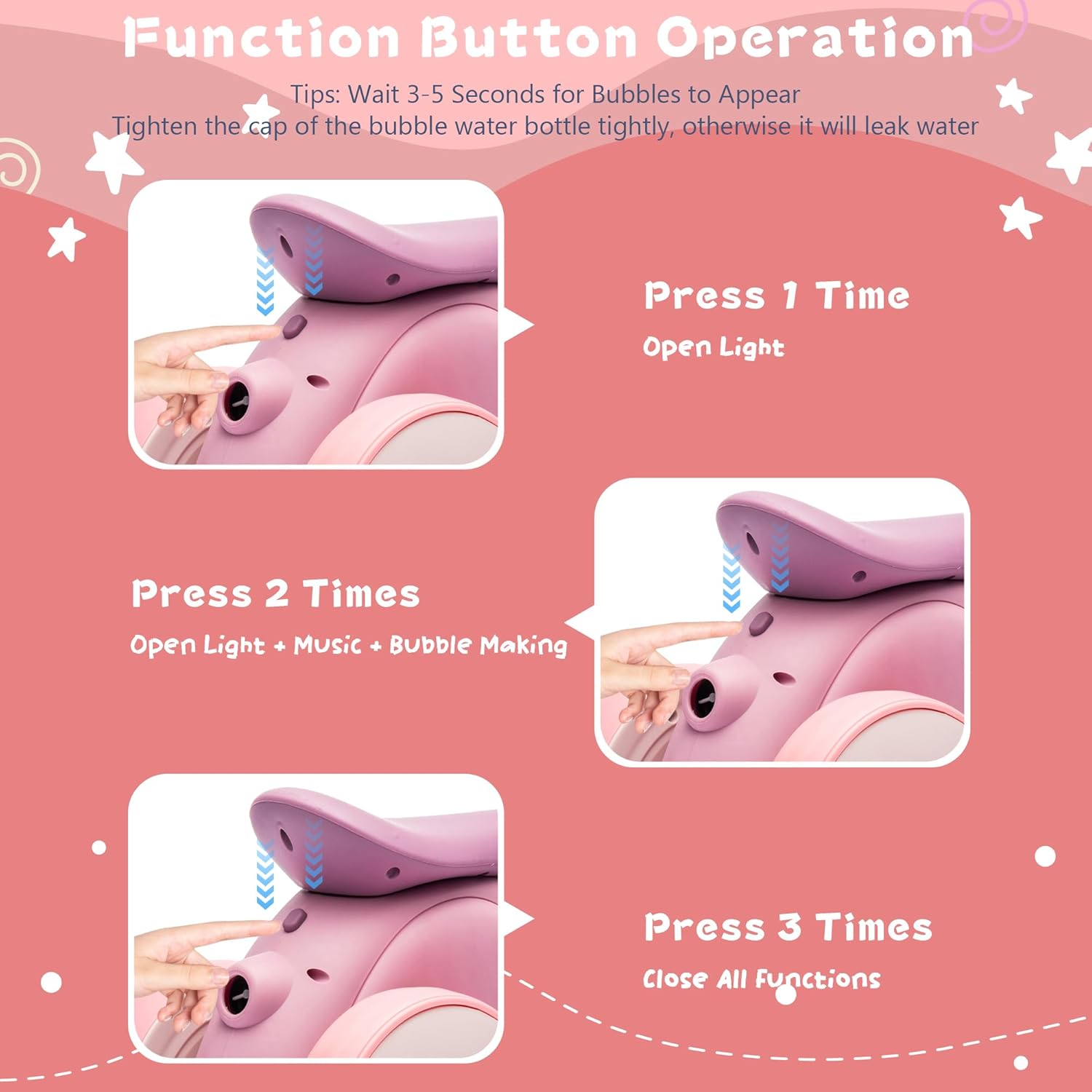 - Comfortable Children Balance Motorbike with Remote & Bubble Machine: Our ride-on toy features a non-slip soft handlebar designed for small hands, while the wider and thicker seat offers excellent shock absorption. With durable EVA wider tires that are noiseless and gentle on wooden floors, and 4 wheels for a smooth ride on various surfaces, it's perfect for both indoor and outdoor activities.