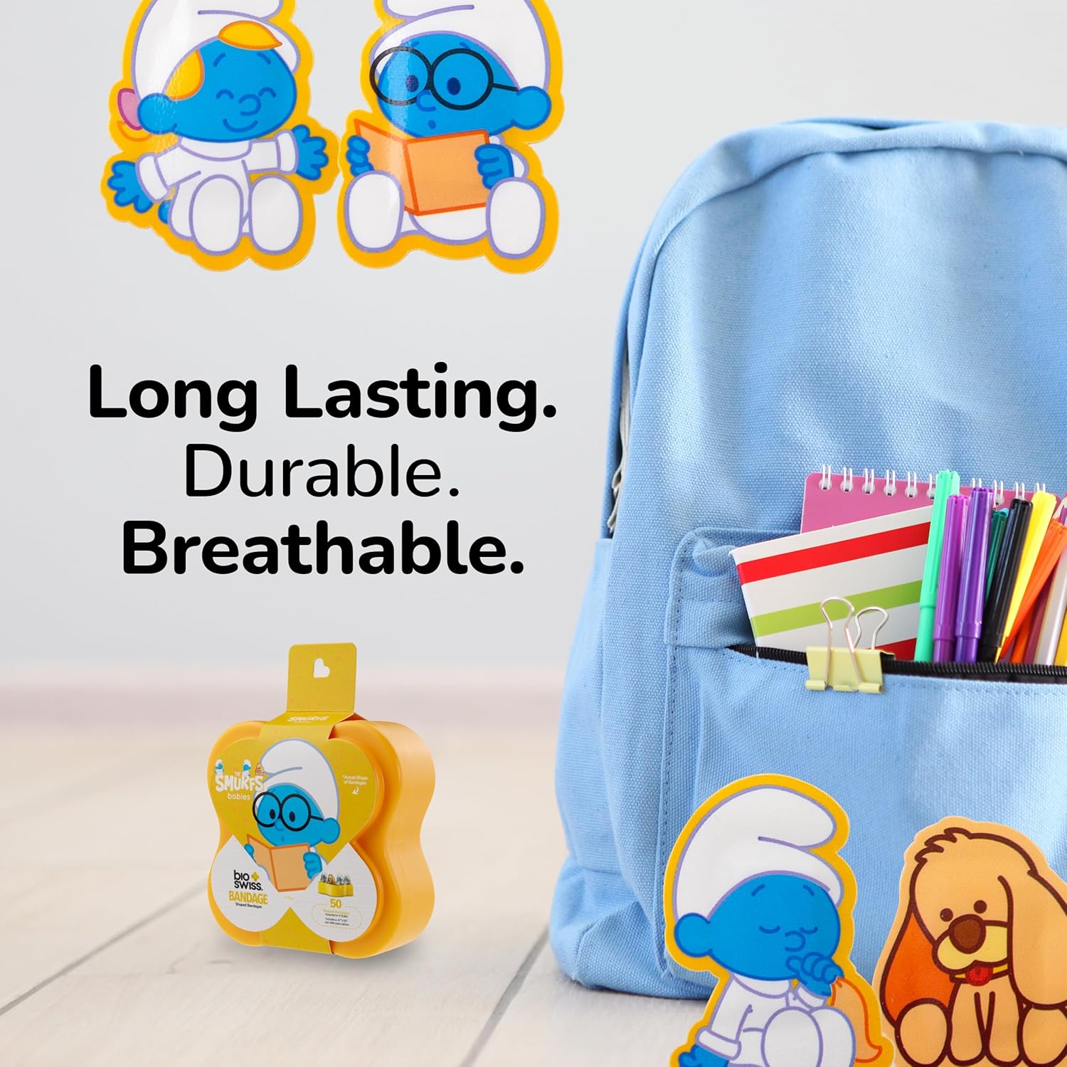 BioSwiss Bandages, The Smurfs Baby Smurf Shaped Self Adhesive Bandage, Latex Free Sterile Wound Care, Fun First Aid Kit Supplies for Kids and Adults, 50 Count Case