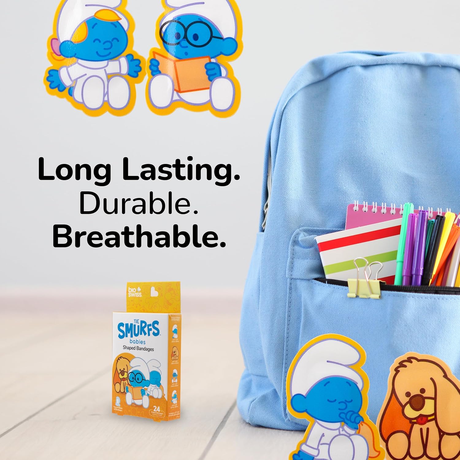 - BABY SMURF BANDAGES: This 24 piece cardboard box of childhood classic cartoon Baby Smurf shaped bandages is great for putting a smile on kids' faces while protecting wounds such as cuts, scrapes, and burns, and come in a variety of your favorite characters; Baby Smurf, Puppy, Brainy Smurf, and Smurfette. These sticky bandages are perfect for kids and adults alike, and also for school nurses and pediatric doctors