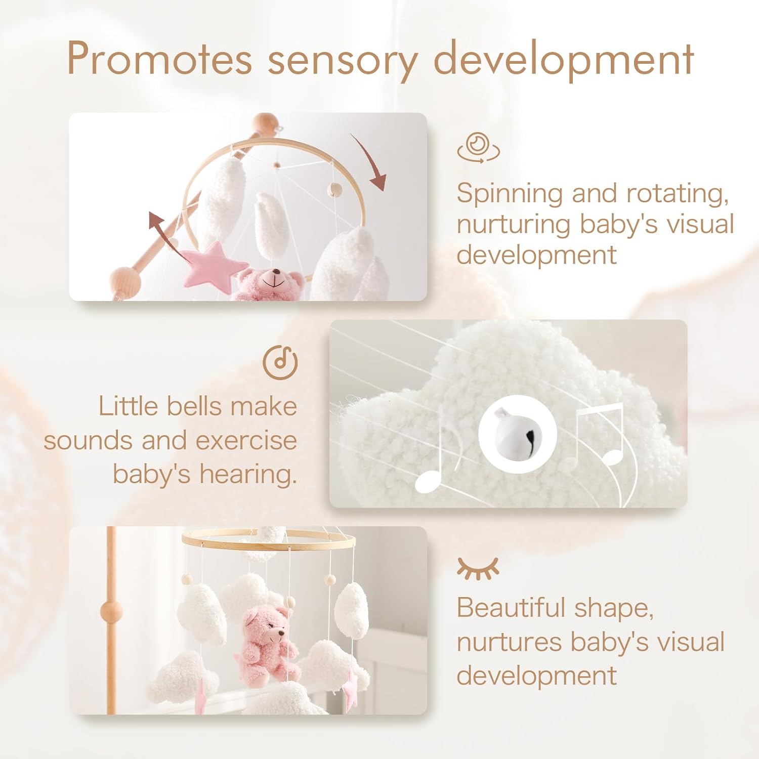 - Teddy Velvet Nursery Mobile:Baby mobile for crib can blend into the nursery design of your choice. The white moon and clouds, pink stars, and pink bear will be focal points in your neutral nursery,We share your goal to making sure your baby is exposed to something nice and safe from birth