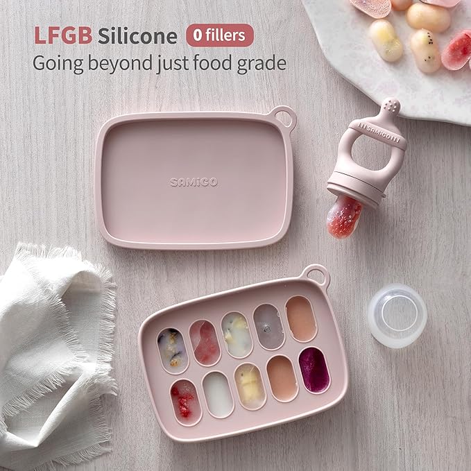 SAMiGO Baby Food Fruit Feeder and Breastmilk Popsicle Mold Set, Silicone Fruit Teether, Food Feeder Pacifier for Teething Relief, Freezer Tray, Baby Feeding Essentials, 4 Months+
