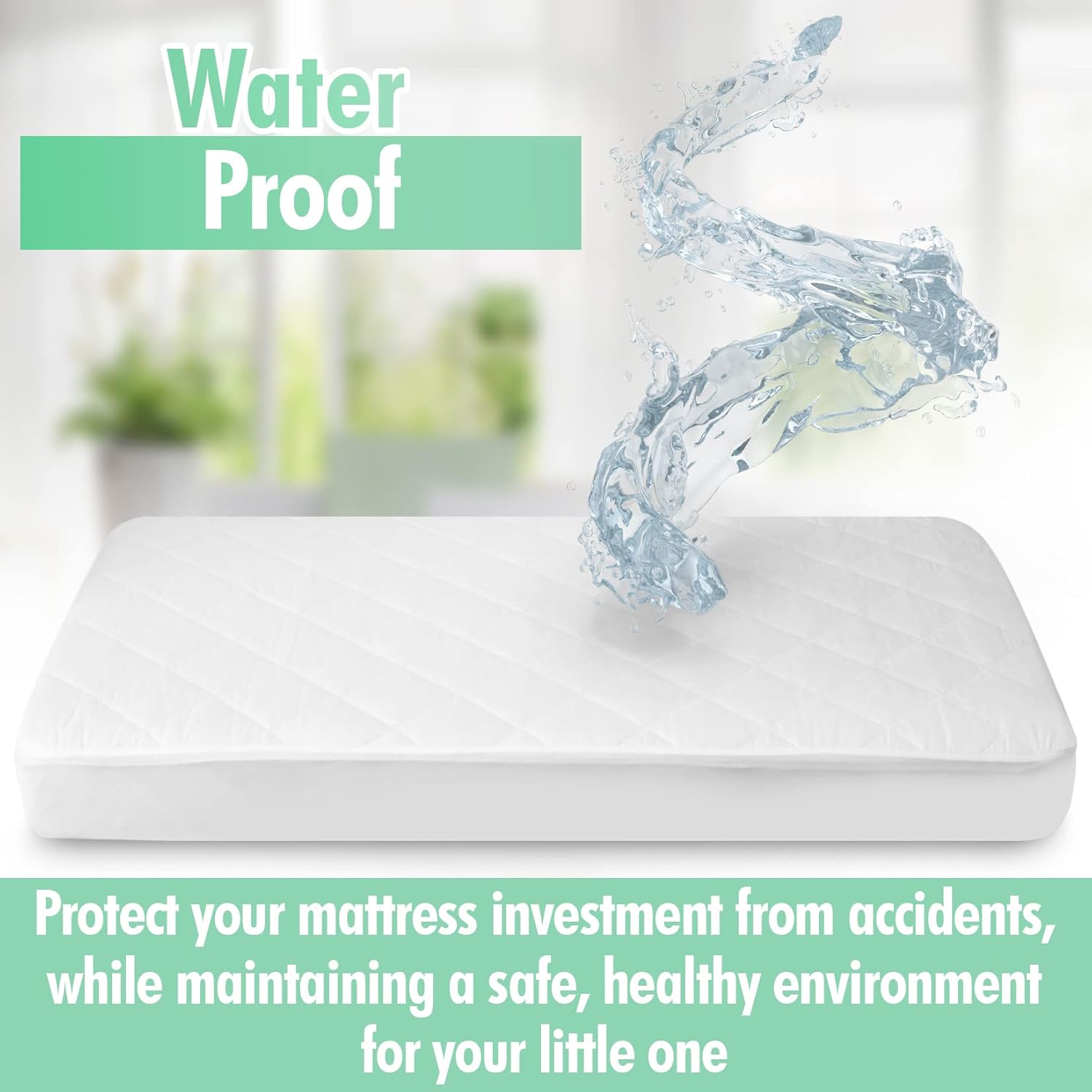 - ~100% GOTS Certified Organic Cotton ~NO: vinyl, NO PVC, NO phthalates, NO latex, NO fire retardants ~Waterproof ~Non-toxic ~No harmful off-gassing ~Hypoallergenic ~Allergen barrier ~Machine washable and dryable ~Withstands frequent washings ~Noiseless design ~Combines safety AND comfort ~Fits standard crib and toddler mattress: 52”L x 28”W x 9”H ~Stretch fit corners for a snug fit ~No need to sacrifice safety and protection for affordability