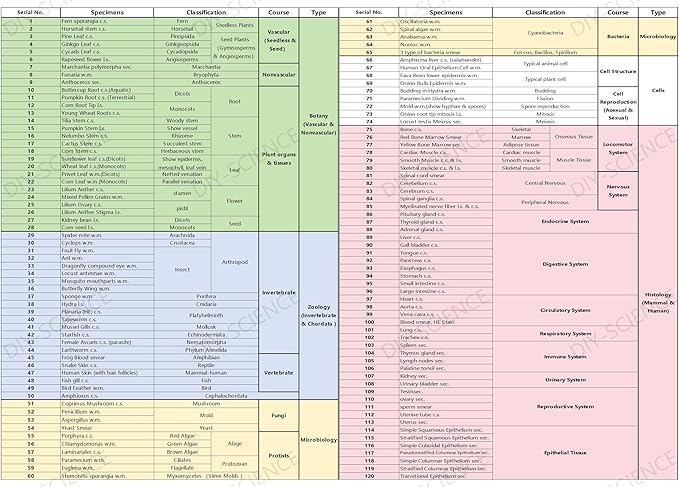- Intended Use: The 120 microscope slides with specimens suitable for science class, homeschool & biology curriculum, various samples covering different topics like biology, botany, zoology, histology, microbiology, cells.