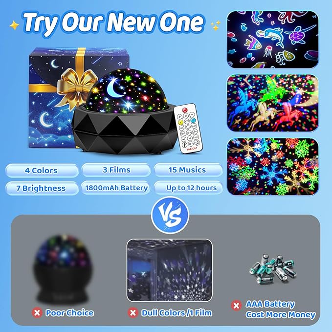 - 🎶【 Kids Night Light Projector for Kids Room+15 White Noises+3 Films+15 Colors+7 Brightness+300 Lighting+360° Rotating+Remote+1800mAh +2 Timer】:The star projector for kids star lights for ceiling, sound machine for kids has 15 BUILT-IN soothing sounds+3 films+300 lights, includes lullabies, white noises&sound of nature(rain, sea wave, fan, bird singing..), a cool kids night light projector night light for kids night light for baby nursery! The kids projector can 360° rotate quietly! Star night light projector for bedroom has 3 FILMS: Stars+Unicorn, Snowflakes &Ocean Animals. A very unique kids projector night light for kids!