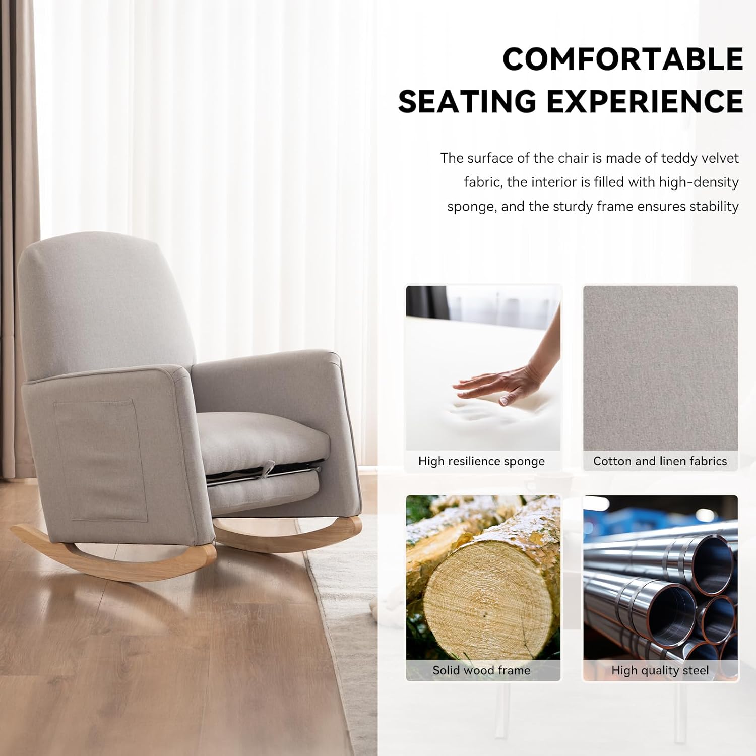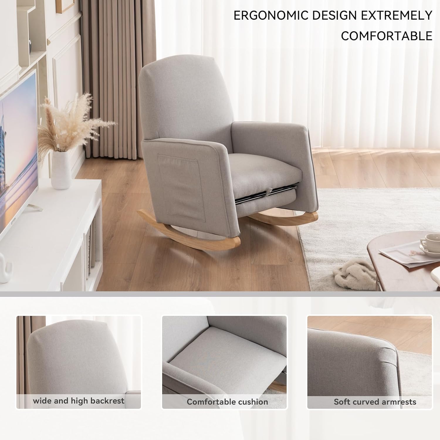 FOXHUNTER Rocking Chair Nursery with Adjustable Footrest and High Backrest, Upholstered Glider Chairs with Side Pockets for Nursery, Rocker Armchair Indoor for Living Room,Light Gray