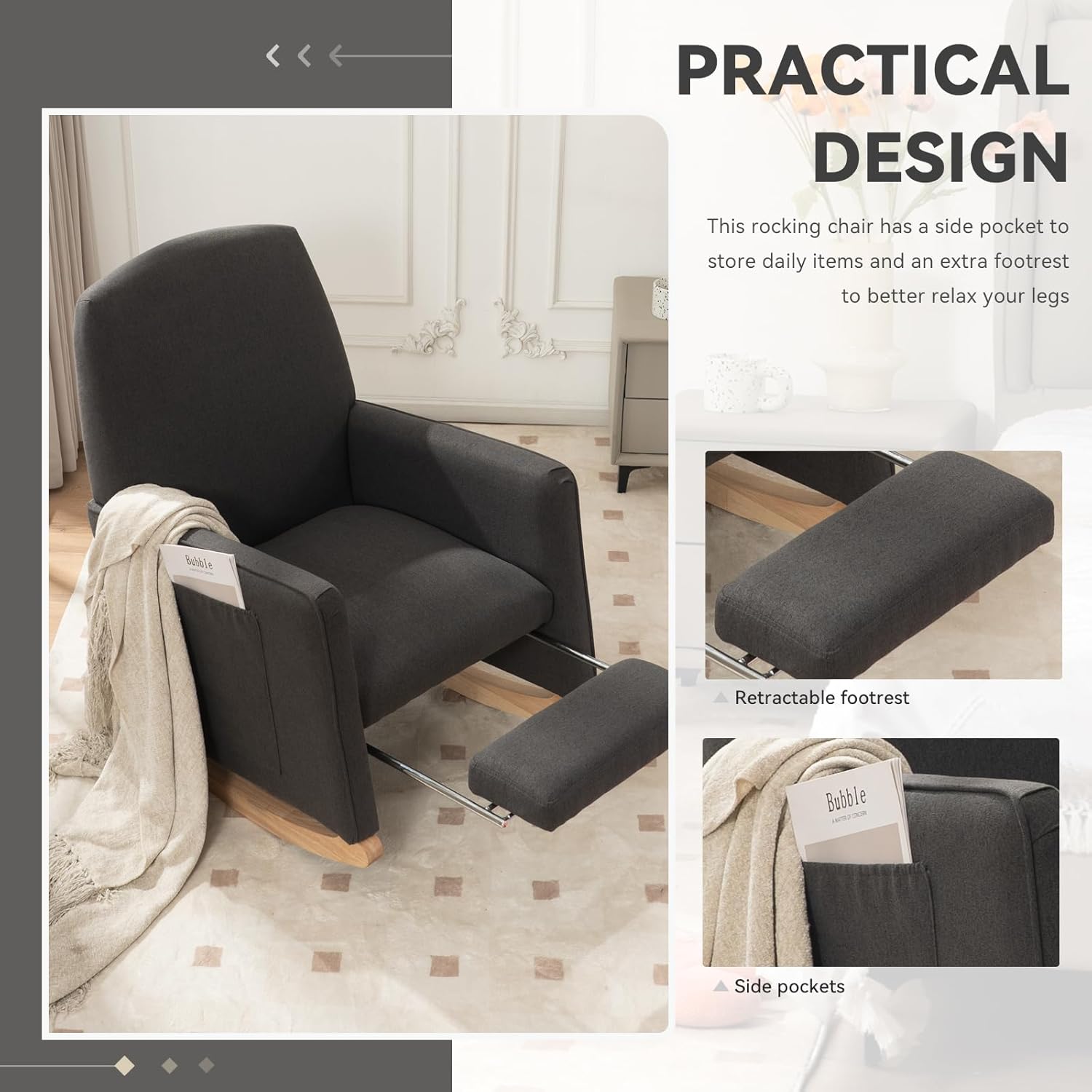 - Practical Pocket & Retractable Footrests:The rocking chair with side pocket keeps your recently read books or magazines close at hand, creating a perfect reading nook for you; Our rocker recliner chair has a retractable footstool underneath the seat can provide extra leg support perfect for long periods of sitting, nursing or rocking, enhancing your overall comfort and ride experience. When not needed, it can be pushed back into place without taking up too much space