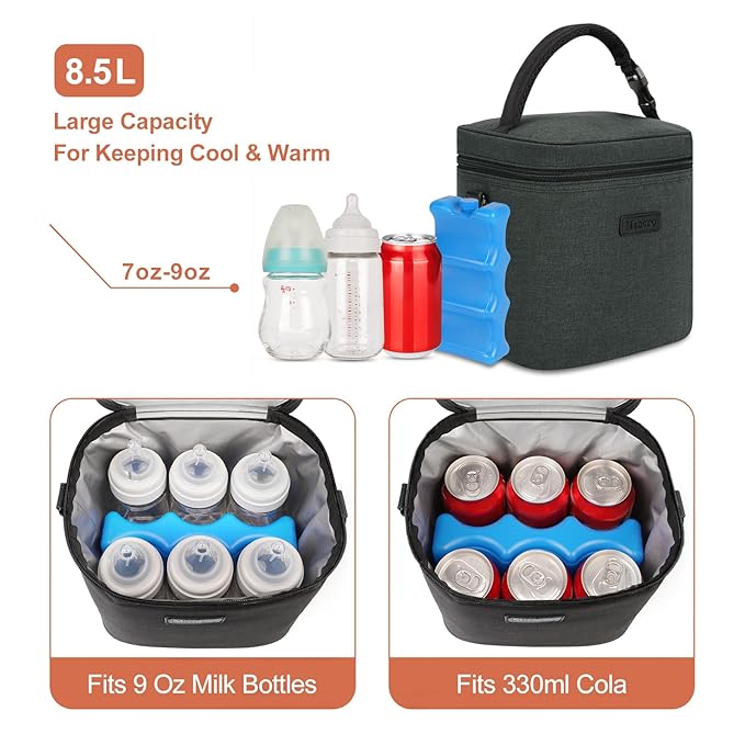 - Large Capacity: Measuring 8.66 x 7 x 8.66 inches, this baby bottle bag is spacious enough to hold up to 6 baby bottles (9 ounces each) or 330 ml beverage cans. Versatile in design, it can be used as both a breast milk cooler bag and a lunch bag, making it an ideal choice for busy moms on the go