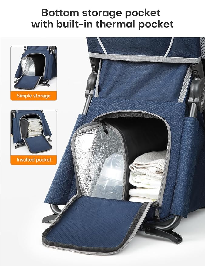 - Ample Storage Space: The backpack has ample space in the form of pockets to keep diaper wipes, water bottles, flashlight, light gear in there without a problem. It also has storage space under the seat and small zipper pockets on the side of the waist belt giving you enough space to store and carry things hassle free. We also attach a storage bag in case you want to pack up stuff.