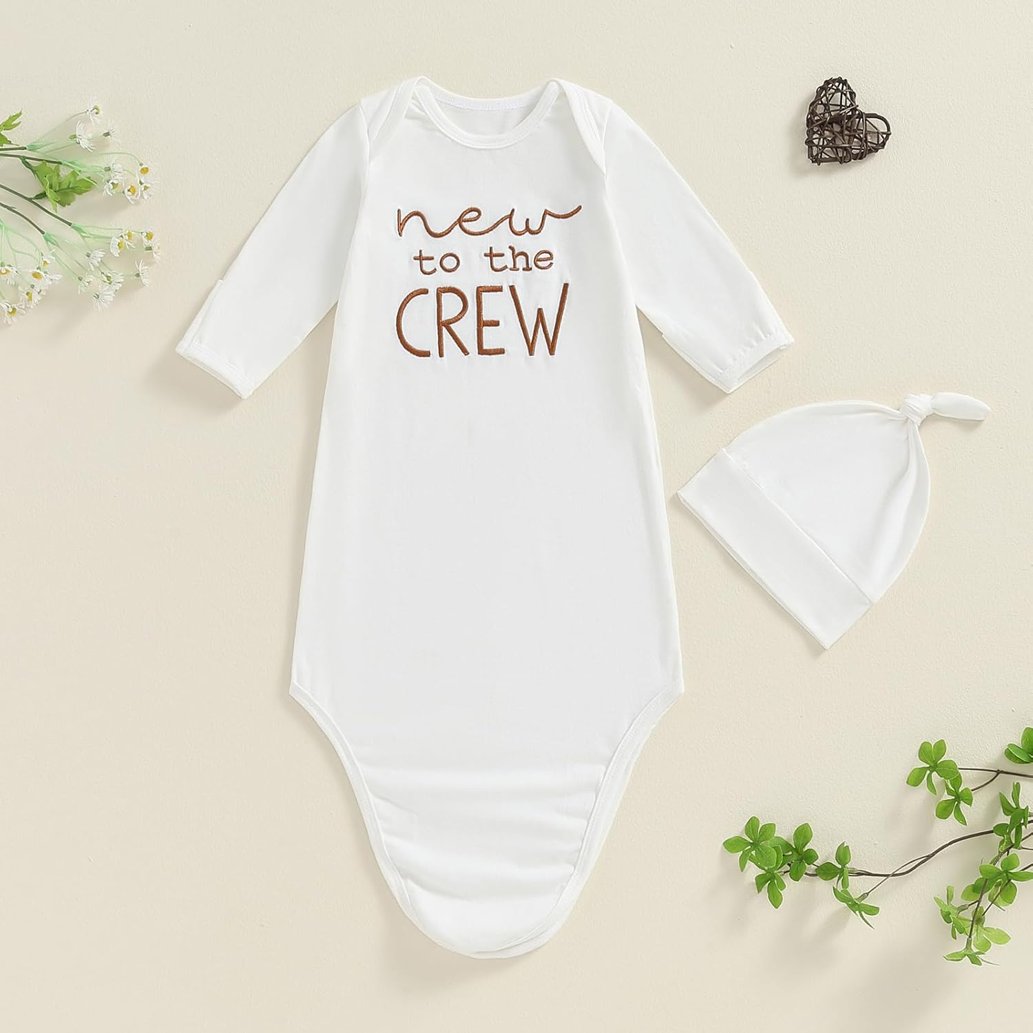 - DESIGN: Newborn knotted gown/open bottom sleeper and hat set, long sleeve infant gowns, Hi I'm new here, New to the crew letter embroidered tie slpeeing bag, baby boy coming home outfits newborn baby nightgowns, infant sleeper baby sleep gown with mittens, cute unisex babies clothing, new born baby essentials must haves