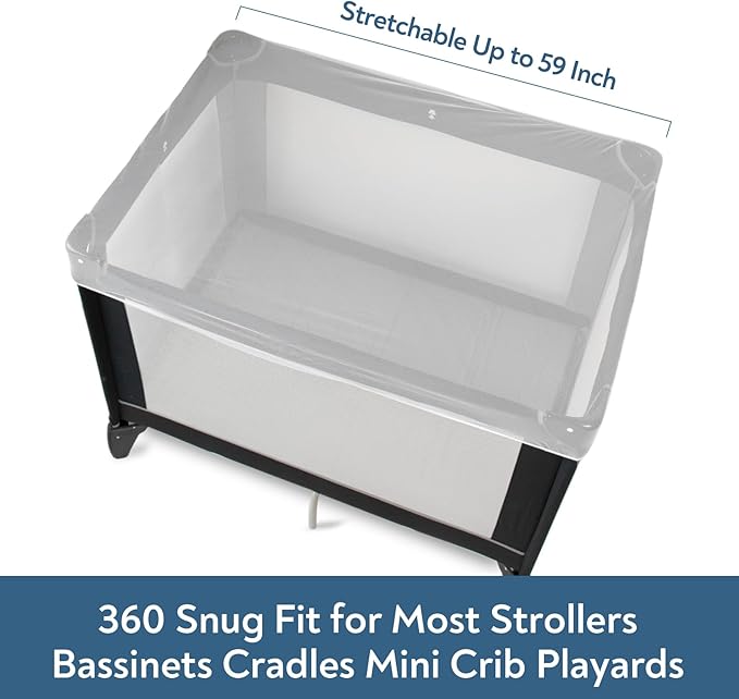 - Stretchable up to 59 inch in length - 360 snug fit for most strollers, baby carseat, bassinets, cradles, mini crib, playards, rocker chairs, bouncers and pack and plays.