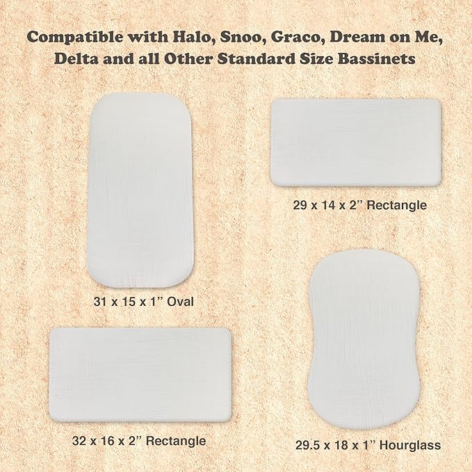 3-Pack Organic Muslin Bassinet Fitted Sheets, Compatible with Halo, Snoo, Graco, Dream On Me, Delta, and Other Standard Size Bassinets - Fits Oval, Hourglass, & Rectangle Shapes (32 x 16 x 4 Inches)