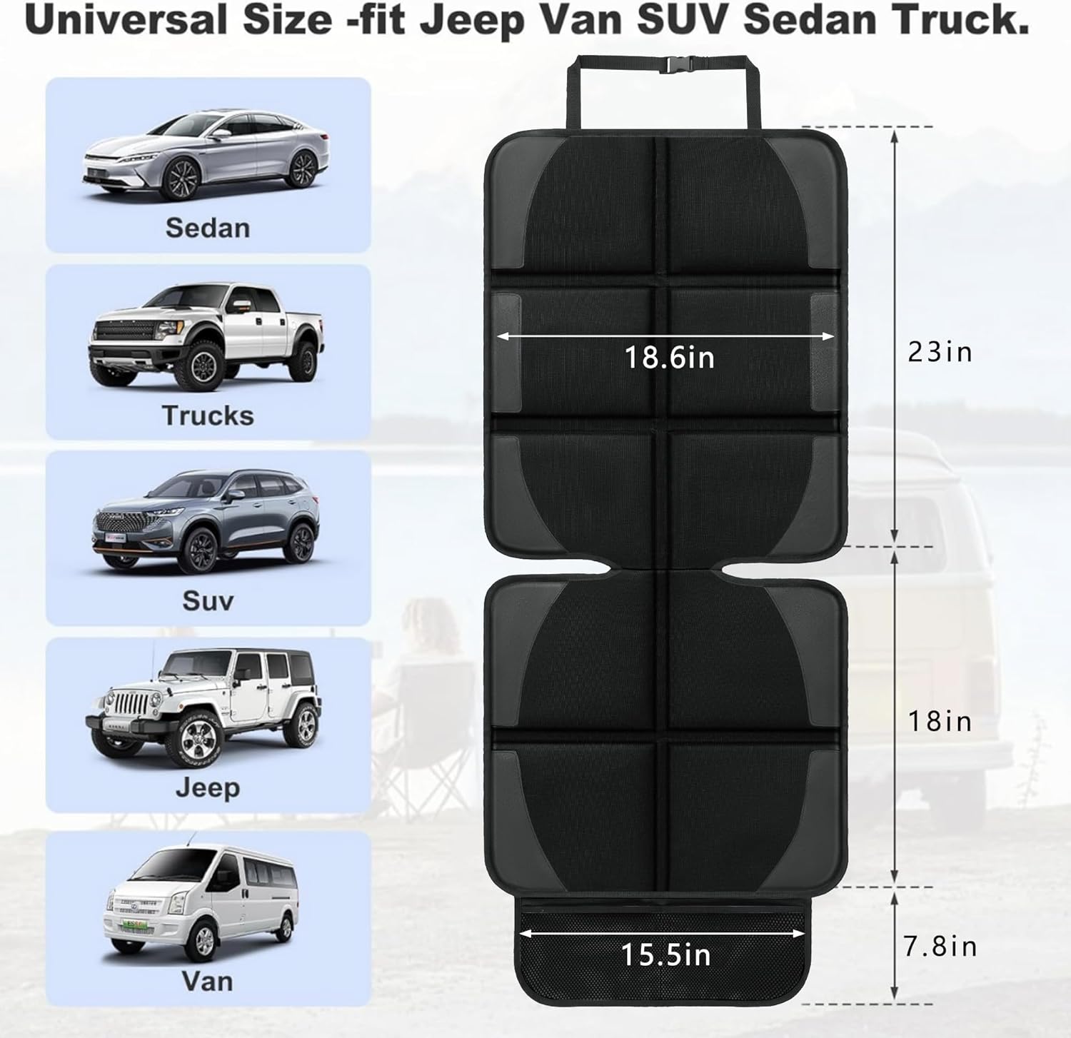 - The whole dimension of the auto seat protector carseat is 18.6 x 48.8 inch, the seat: 18 x 18.6 inch, the back: 23 x 18.6 inch, and the mesh pocket: 15.5 x 7.8 inch. Universal fit Jeep Van SUV Truck
