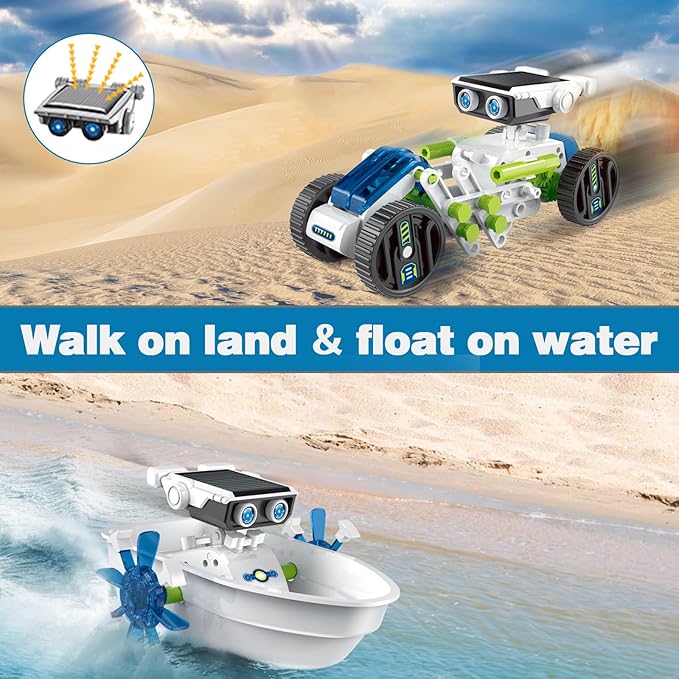 - STEM 12-in-1 Solar Robot Kit: The robot kit contains 208 parts. Kids can disassemble and reassemble it according to the steps in the user manual to create 12 different shapes of robots, which can walk on land or sail on water. The STEM toys not only exercise children’s problem-solving and hands-on skills but also increase the sense of parent-child interaction with the help of family members, making it a learning and educational toy for children aged 8 to 14 years old