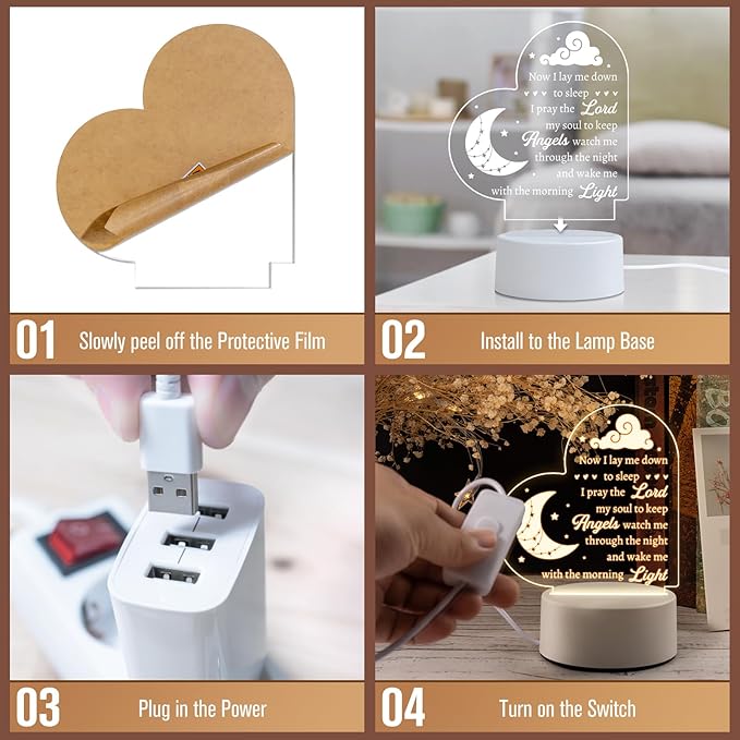 - 【Baptism Night Light for Bedtime Prayer】The heart-shaped acrylic plaque of this children's baptism night light bears a touching and warm inscription: "Now I lay me down to sleep, I pray the Lord my soul to keep. Angels watch me through the night and wake me with the morning light." Ideal as a baptism gift for kids, bedtime prayer gift, birthday gift, or anniversary present.