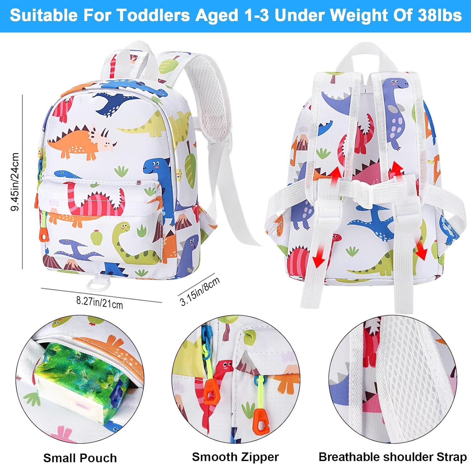 - Compact Size: The small kid harness backpack is suitable for toddlers aged 1-3 under weight of 38 lbs. Length of the shoulder strap can be adjusted freely. Fantastic little backpack, perfect to fit your kids' essentials in as nappy, wipes, bottle, change of clothes, snack, toys etc.
