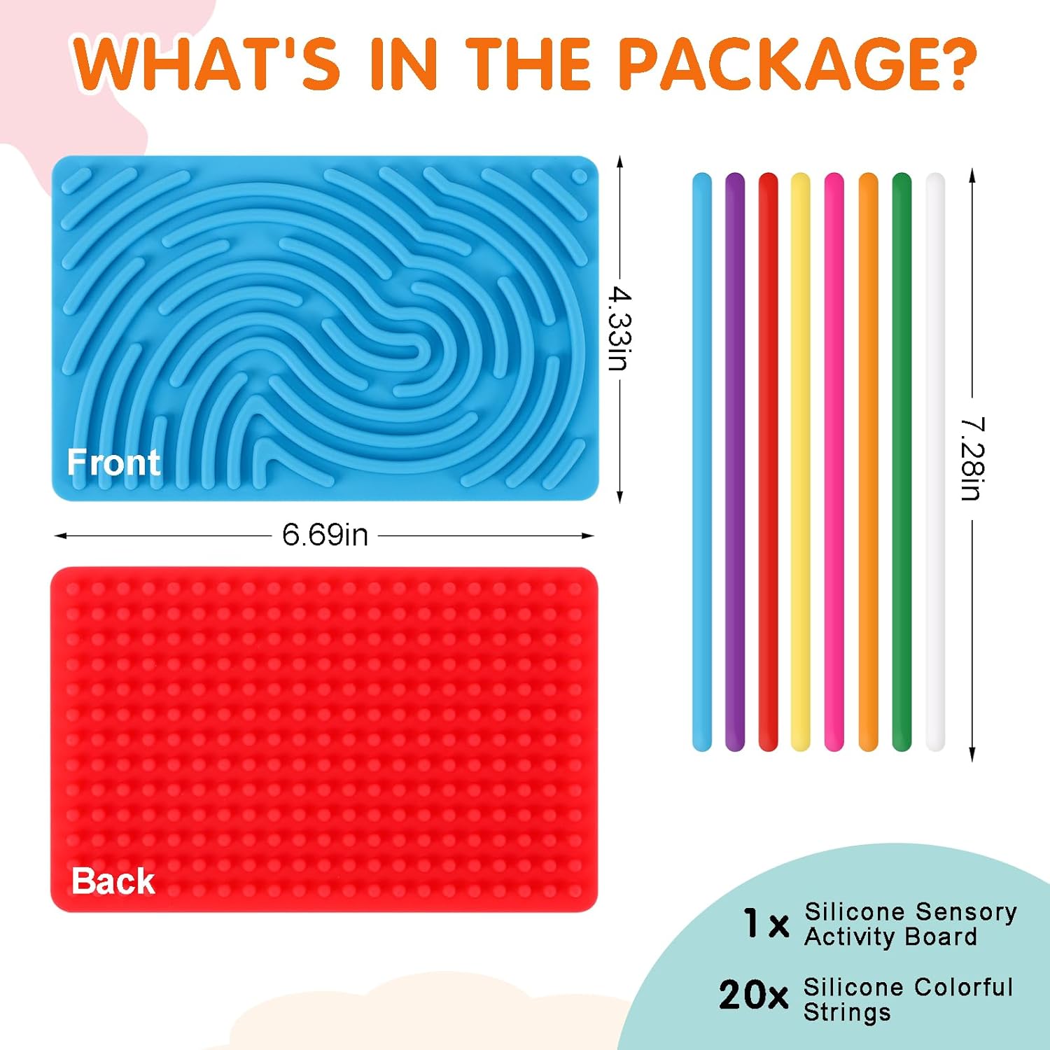 - 【Double Sided Busy Board】- With 2 silicone fidget toys and 20 strings. Sensory activity board with double-sided design for more play options, soft-touch, flexible silicone material, hours of fun for kids through pushing, peeling, tying and bridging