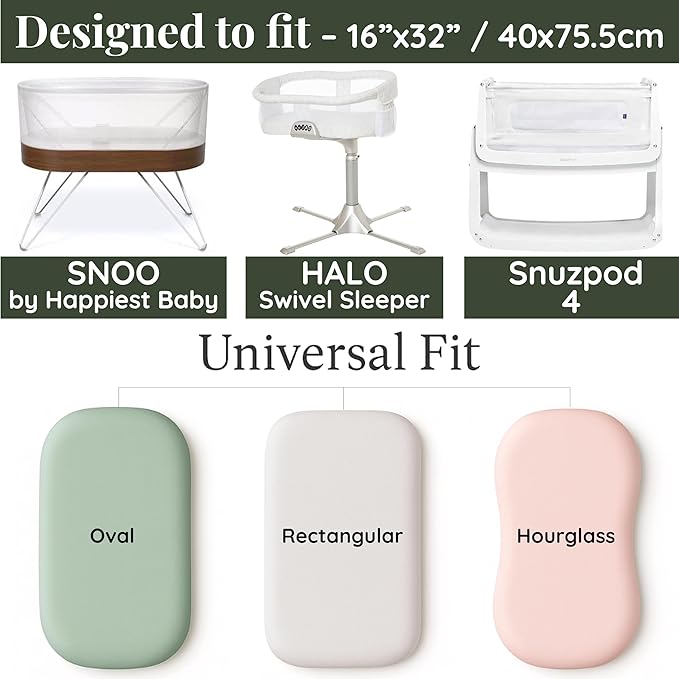 - TAILORED TO FIT RECTANGLE , HOURGLASS & OVAL PADS: Each sheet fits mattresses up to 32x16", stretching gently for a smooth, secure fit. Perfect for HALO bassinest swivel sleeper sheets Snoo by happiest baby, Simmons, and Delta Children bassinets oval and rectangular bassinet sheets.