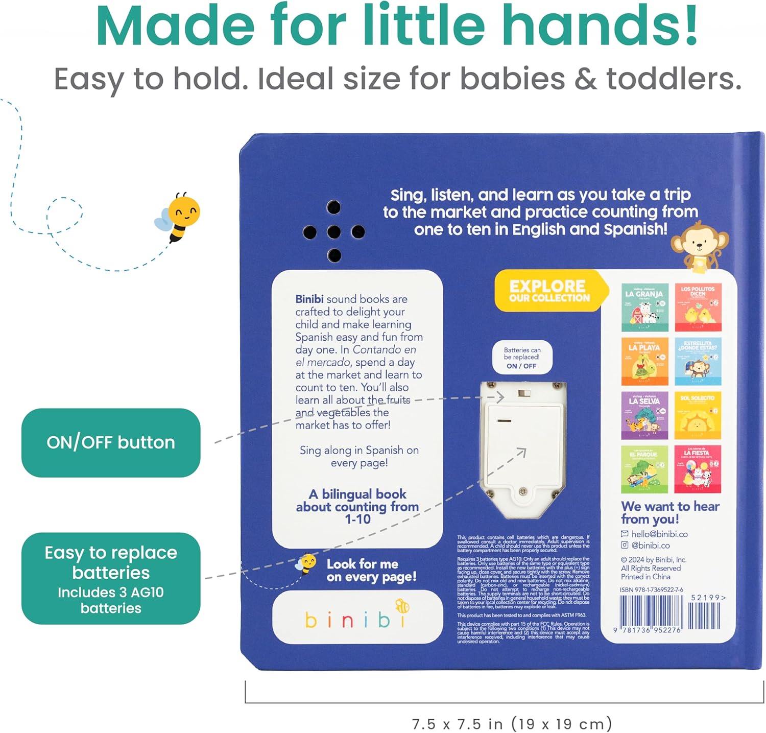 - ๐๐๐ฟ๐ฎ๐ฏ๐น๐ฒ & ๐ ๐ฎ๐ฑ๐ฒ ๐๐ผ๐ฟ ๐๐ถ๐๐๐น๐ฒ ๐๐ฎ๐ป๐ฑ๐. Binibi bilingual English-Spanish books for babies & toddlers 1-3 are durable and feature hard covers, thick pages and rounded corners - they are made for little hands and are easy to clean! All Spanish musical sound books feature an on/off button for extended battery life, and easily replaceable batteries. 3 AG10 batteries in every book.