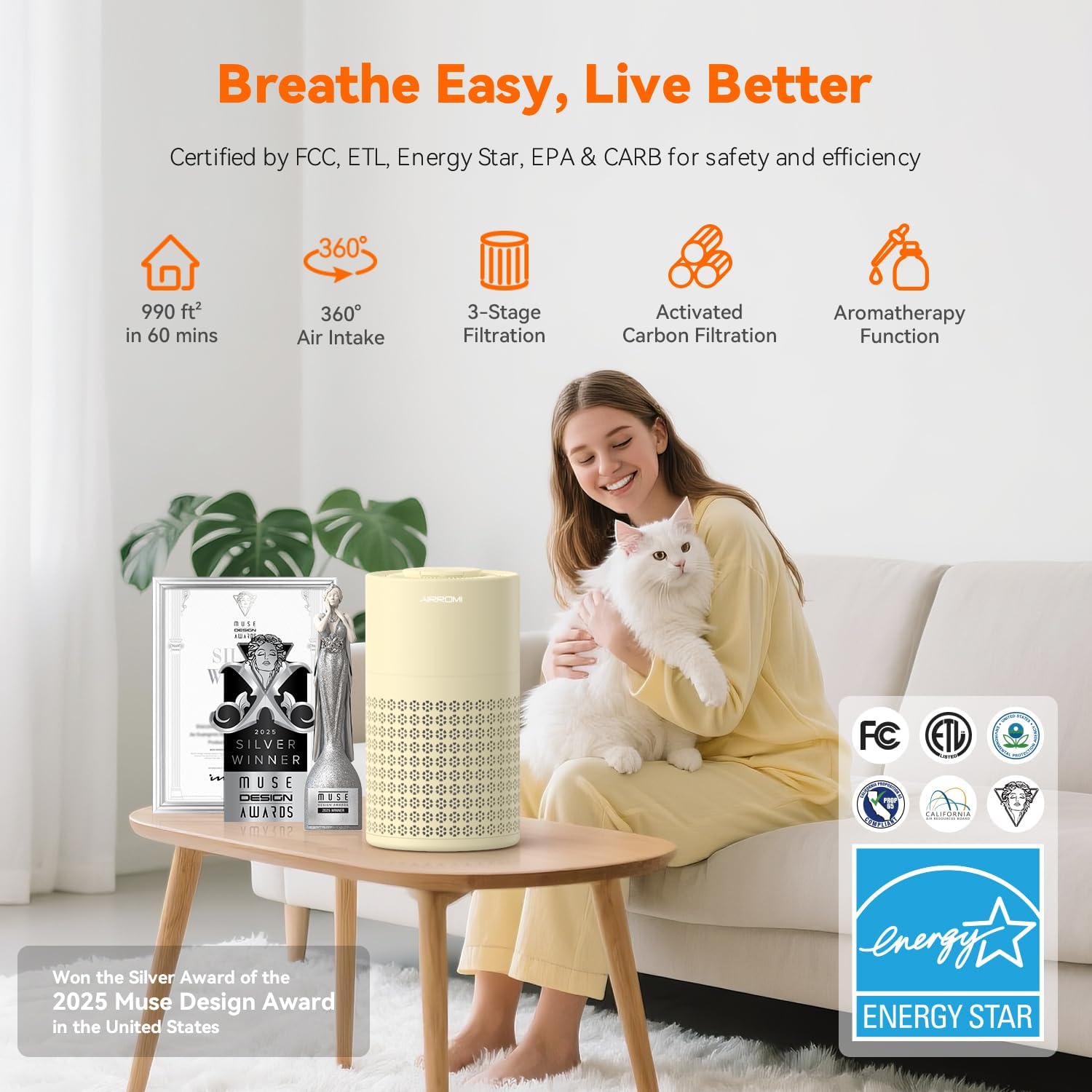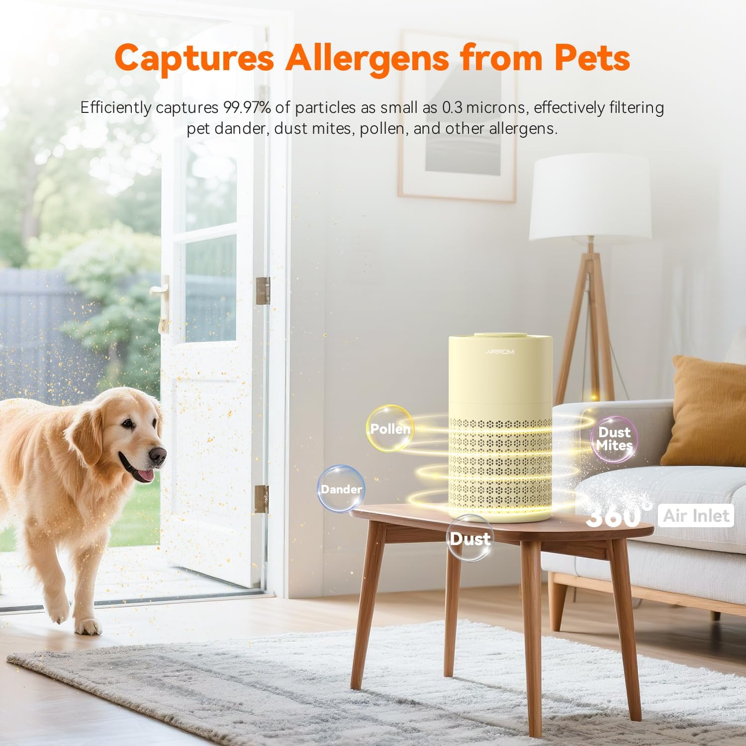 AIRROMI Air Purifier for Bedroom with HEPA Fet Filters, Pet Air Purifiers for Home Cat Pee Smell, Covers Up to 990Ft², Quiet 360° intake Air Cleaner for Allergies Dust Smoke Odor A2001 Yellow
