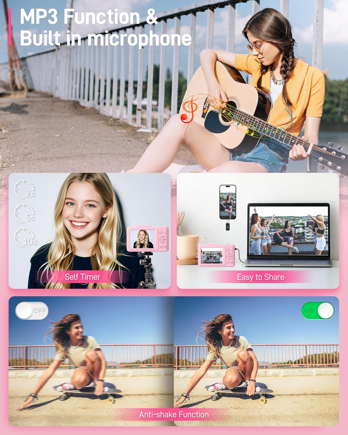 - 【HD Digital Camera】The camera digital features 2024 newest CMOS image sensor and 5-axis stabilization, delivering crisp full HD 1080P videos and 48MP photos. Features macro mode, enable clear shooting of flowers, plants, or small insects. No difficult setup, camera for kids and teens can easily operate ideal for cultivating their interest in photography and recording the happy moments at parties, holidays trips and any small adventure.