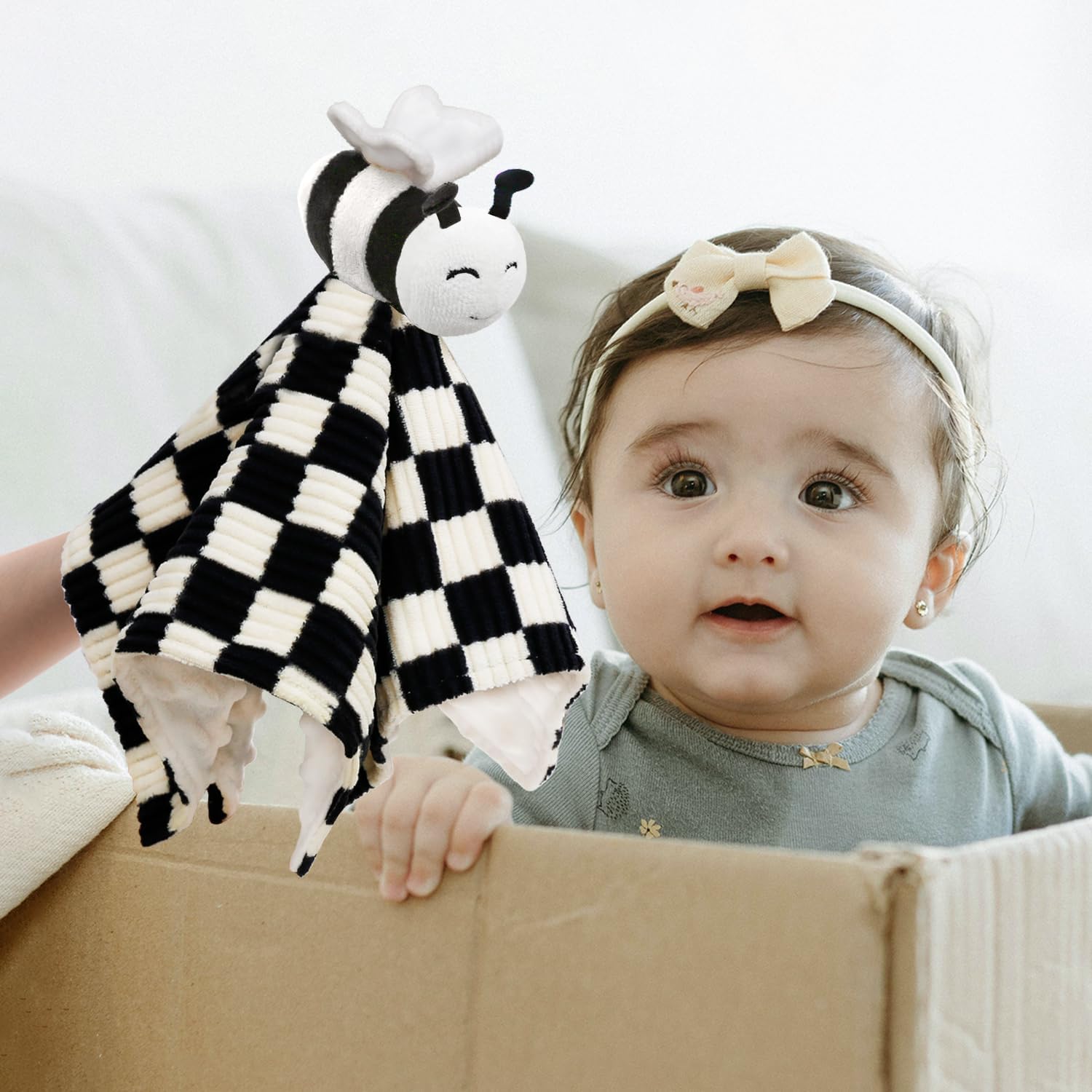 - CUTE DESIGN --- Our lovely baby security blanket features black and white color combinations with 3D stripe gingham design. And the eyes of lovey blanket are embroidered and safe for the babies. When the baby is 0-12 months old, the black and white colors are more attractive to baby and inspire the baby’s vision development
