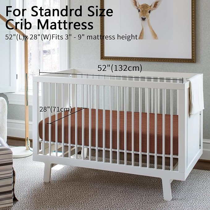 - 𝐅𝐢𝐭 𝐒𝐭𝐚𝐧𝐝𝐚𝐫𝐝 𝐒𝐢𝐳𝐞 𝐂𝐫𝐢𝐛 𝐌𝐚𝐭𝐭𝐫𝐞𝐬𝐬- Measuring 28" X 52" X 9", our stretchy crib sheets fit almost all standard crib mattress and toddler bed mattress. The fitted crib sheets are professionally sewn with soft elastic all around the edge to keep it securely in place and at the same time make changing it a quick and easy task for you.