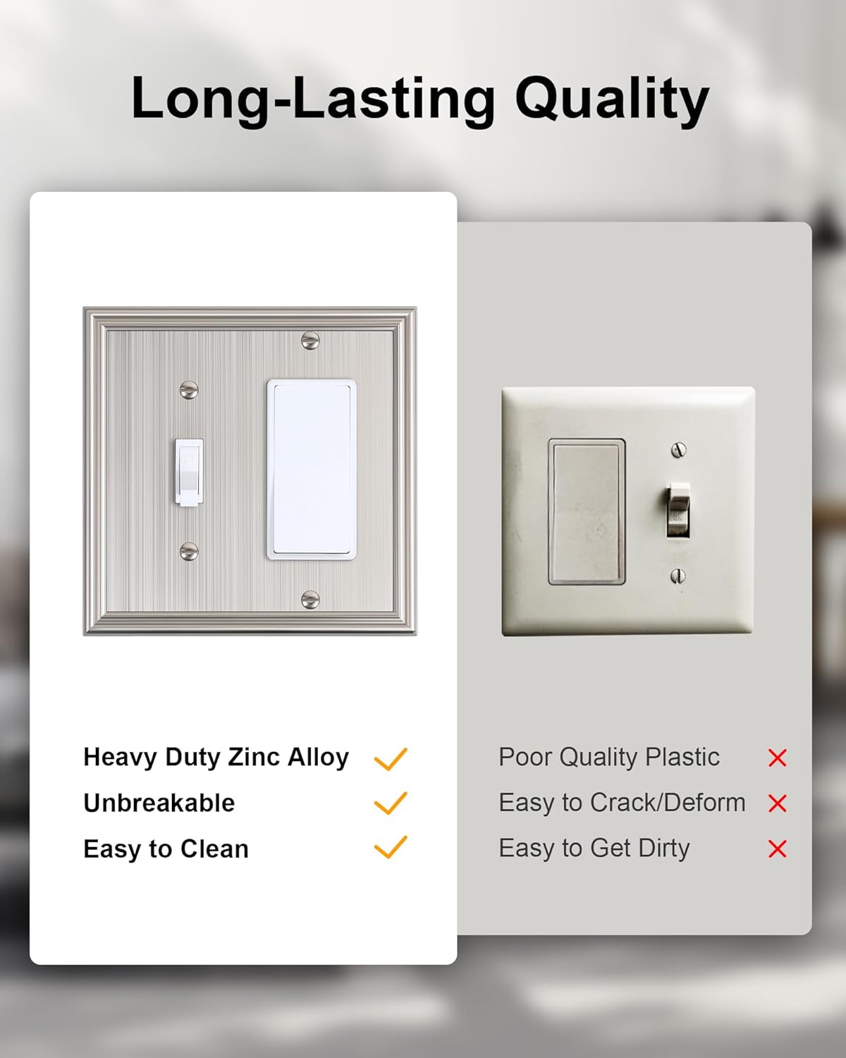 - Durable Solid Zinc Alloy - Constructed from thick and sturdy zinc alloy, the Combo Toggle/Decorator switch plate cover offers exceptional durability and sturdiness, easier to clean and maintain. It is resistant to high impact, tarnishing, and corrosion, unbreakable. Ensuring it remains its stunning appearance for years to come.