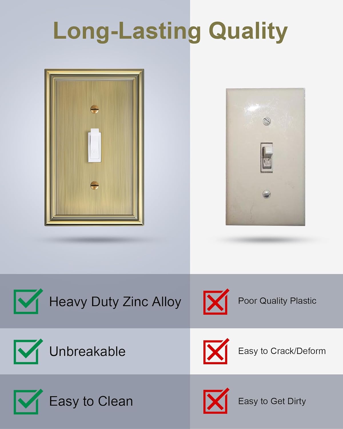- Durable Solid Zinc Alloy - Constructed from thick and sturdy zinc alloy, the light switch cover plate offers exceptional durability and sturdiness, easier to clean and maintain. It is resistant to high impact, tarnishing, and corrosion, unbreakable. Ensuring it remains a stunning and long-lasting addition to your home.