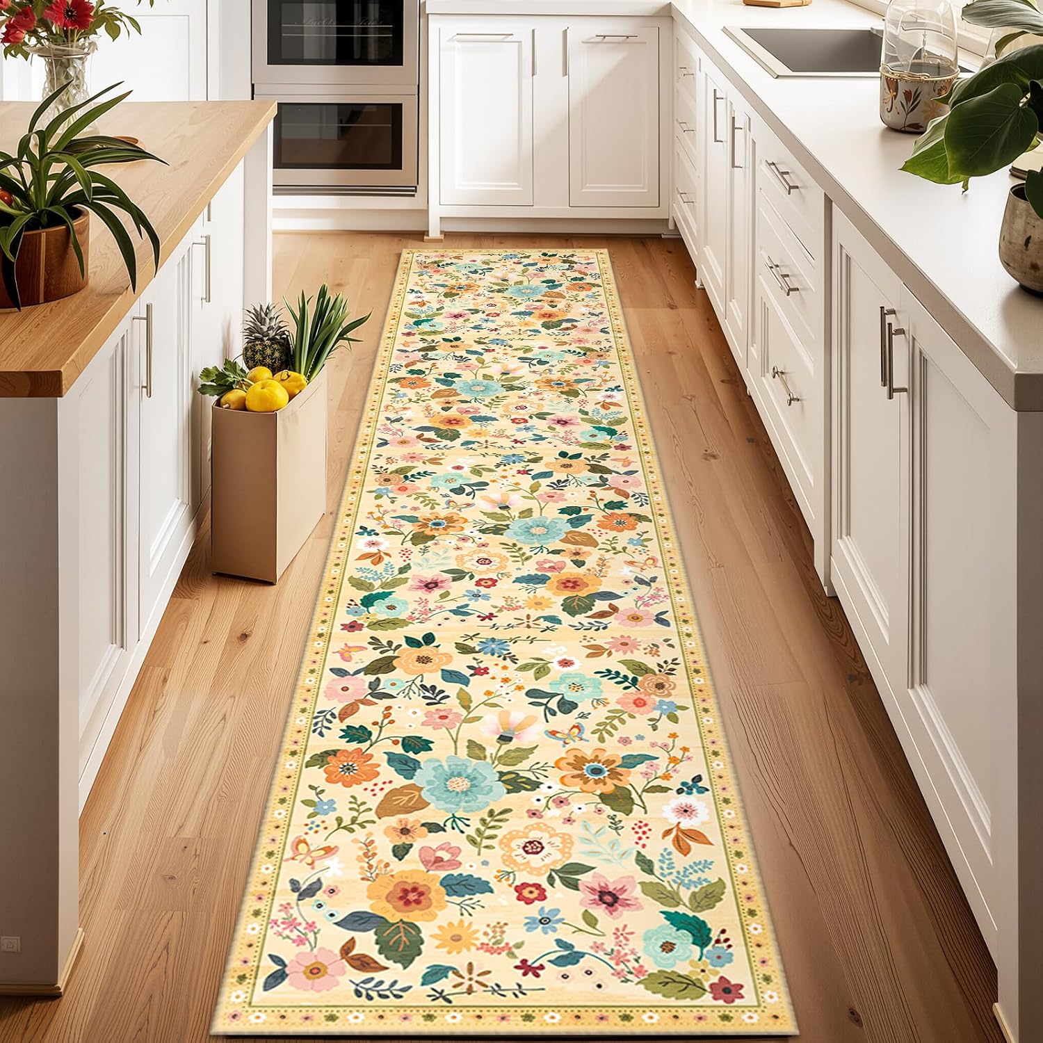 Floral 2x10 Area Rug Machine Washable Soft Print Boho Carpet Non Slip Doormat Low Pile Flower Area Rugs for Living Room Bedroom Nursery Kitchen Dining Room Indoor-Ivory/Yellow