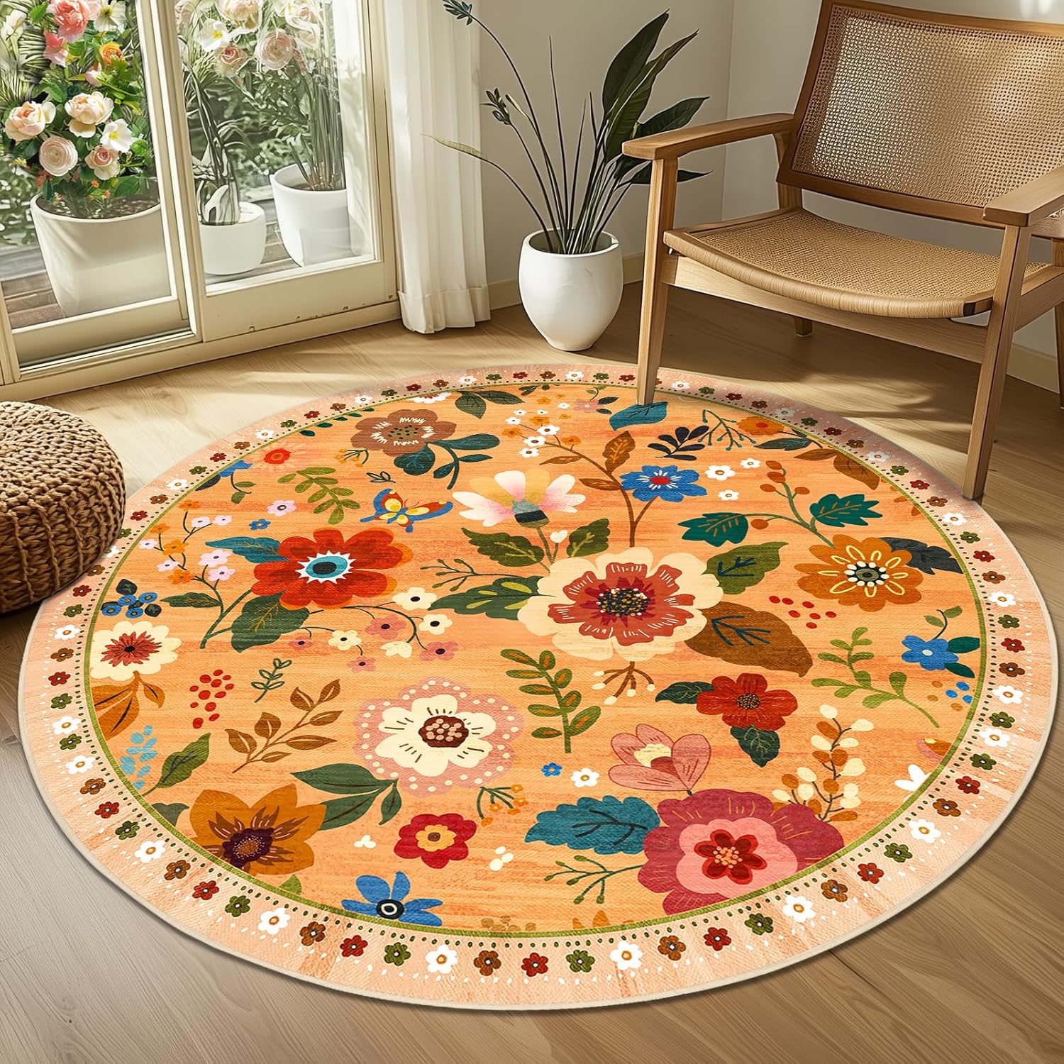 Floral 4ft Area Rug Machine Washable Soft Print Boho Carpet Non Slip Doormat Low Pile Flower Area Rugs for Living Room Bedroom Nursery Kitchen Dining Room Indoor-Yellow/Orange
