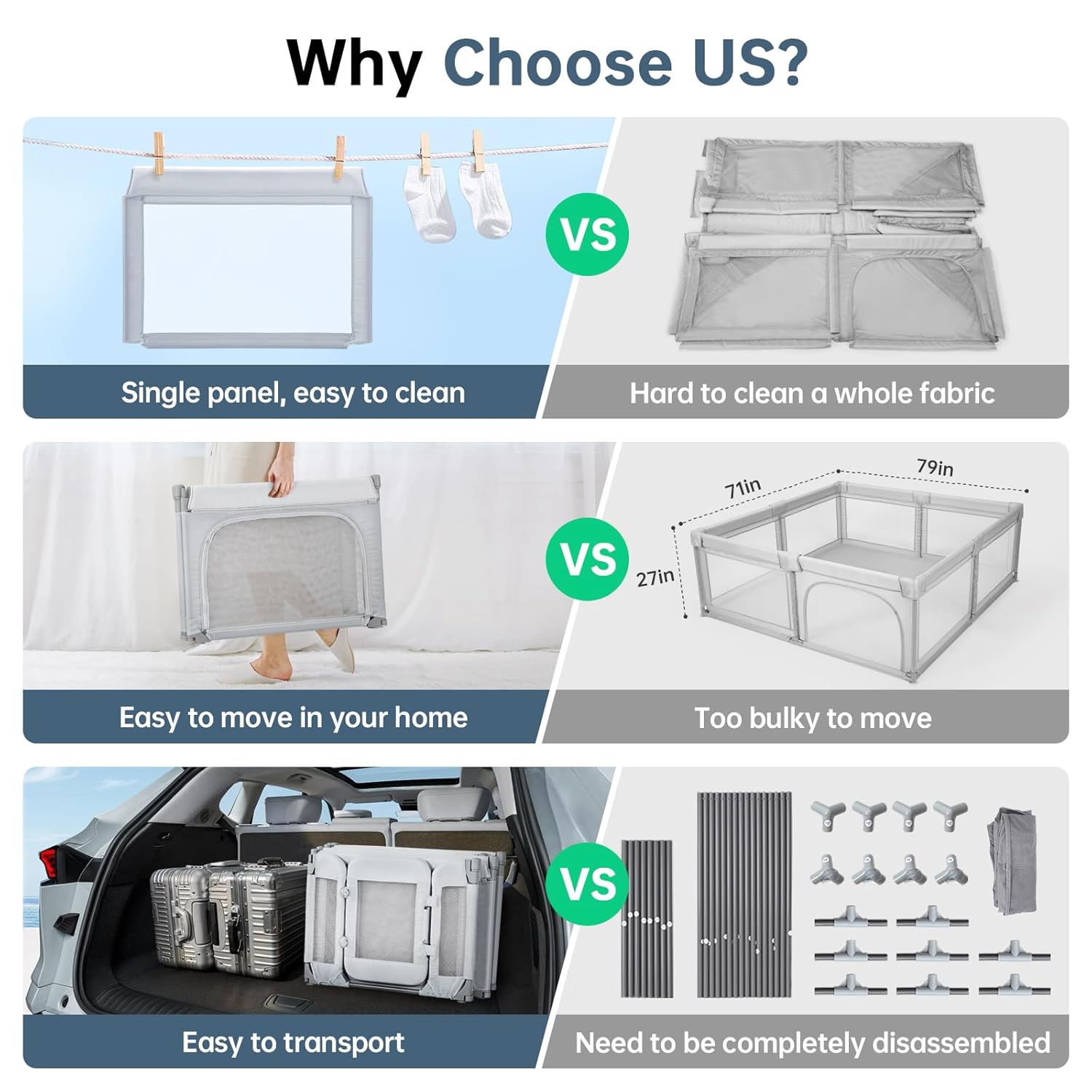 - [Extra Large Space]: With dimensions of 79 x 71 inches,the baby playpen provides spacious space for both parents and toddlers, ensuring a safe and fun environment for your baby to explore whether indoors or outdoors.