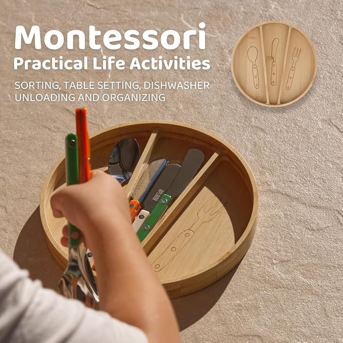- Encourage Responsibility and Independence - Help your child develop key life skills with the Montessori-inspired bamboo tray included with our kids metal cutlery set. The tray features designated compartments for spoons, forks, and knives, teaching organization, sorting and responsibility as your child learns to set the table and keep their utensils neatly stored.