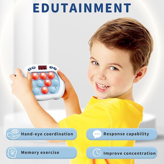 - 【Educational and Stimulating LED Screen】:Immerse yourself in educational challenges with an LED screen displaying an extensive 999 levels across various game modes. This quick push bubble game not only enhances children's concentration and motor skills but also fosters positive thinking and enhances hand-eye coordination. The vibrant lights and dynamic sound effects create a stimulating environment that promotes sensory development in a playful manner.