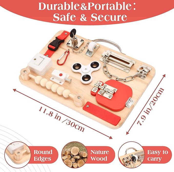 - Premium Safety & Quality: Crafted with care, our Busy Board is handmade from natural wood and non-toxic materials. Each piece is meticulously hand-polished, ensuring a safe and smooth surface for your child's exploration.