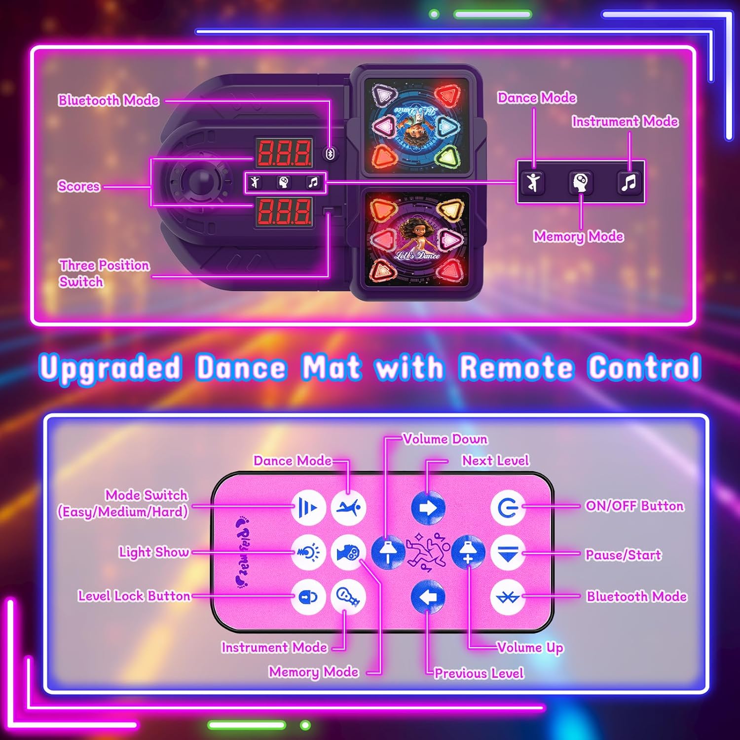 - Exciting Instrument and Light Show Functions Bring Even More Fun --- Our kids dance mat features classic modes (Dance, Memory, Bluetooth) as well as the new Instrument and Light Show modes, transforming every dance into a creative experience! 【Instrument Mode】: The dance mat produces drum and piano sounds, allowing kids to create a unique musical experience that enhances creativity and interactivity in their dance. 【Light Show Mode】: The lights flash to the beat of the music, elevating the dance atmosphere and creating a stunning visual display that immerses players in an energetic experience!