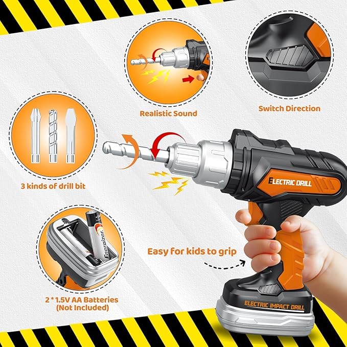 - This realistic toy drill set features 3 interchangeable drill bits for versatile play. Press the switch to activate the buzzing sound and drilling motion, mimicking a real drill! The engaging sounds and movements encourage imaginative play and creativity. This tool set makes a wonderful gift for children ages 3 and up.