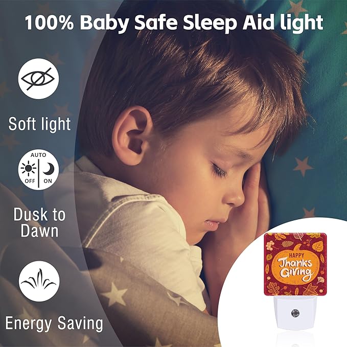 Happy Thanksgiving Night Light for Kids,Autumn Fall Orange Pumpkin Maple Leaf Night Light Plug in with Dusk to Dawn Sensor,0.5w Energy Saving Nightlight for Hallway Stairway Kitchen Bedroom