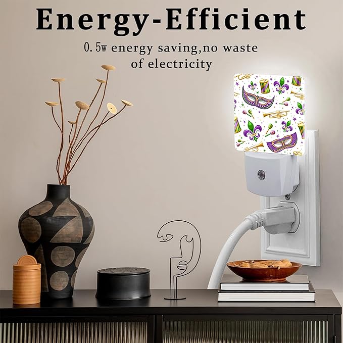 Mardi Gras Carnival Night Light, Fleur De Lis Mask and Musical Instruments Dusk to Dawn Night Light Plug in,0.5w Energy Saving Sleep Friendly NightLight for Kids Boys Girls Home Decor