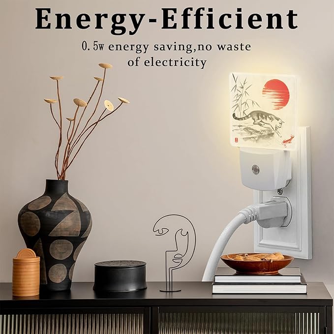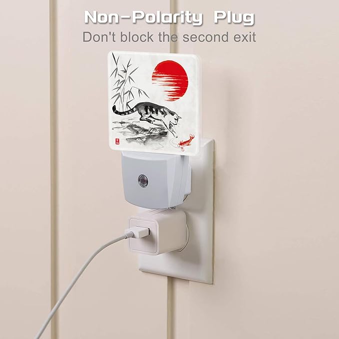 Watercolor Cat and Koi Fish Night Light, Red Sun Bamboo Ink Painting Dusk to Dawn Night Light Plug in,0.5w Energy Saving Sleep Friendly NightLight for Kids Boys Girls Home Decor