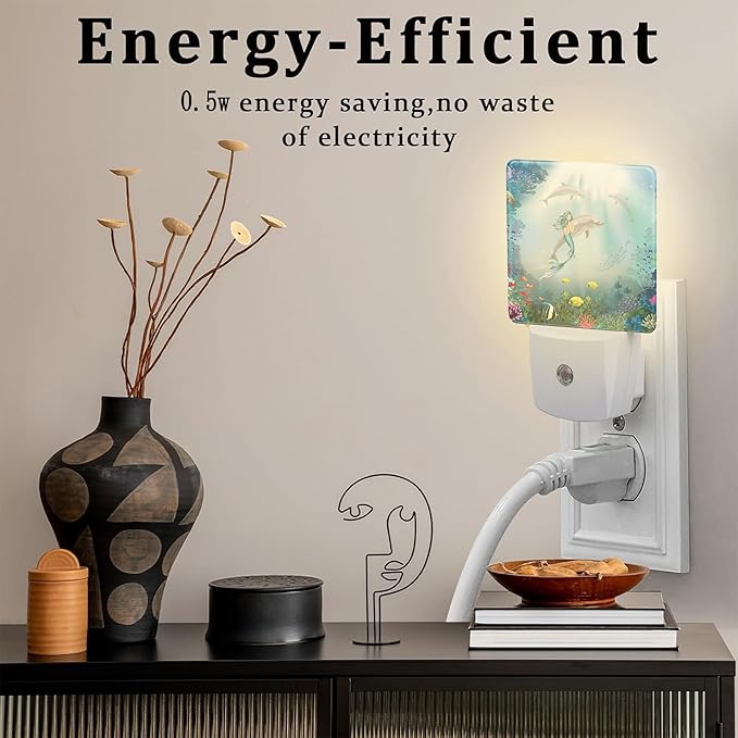 Cute Dolphins with Mermaid Night Light, Underwater World Marine Fish Corals Dusk to Dawn Night Light Plug in,0.5w Energy Saving Sleep Friendly NightLight for Kids Boys Girls Home Decor