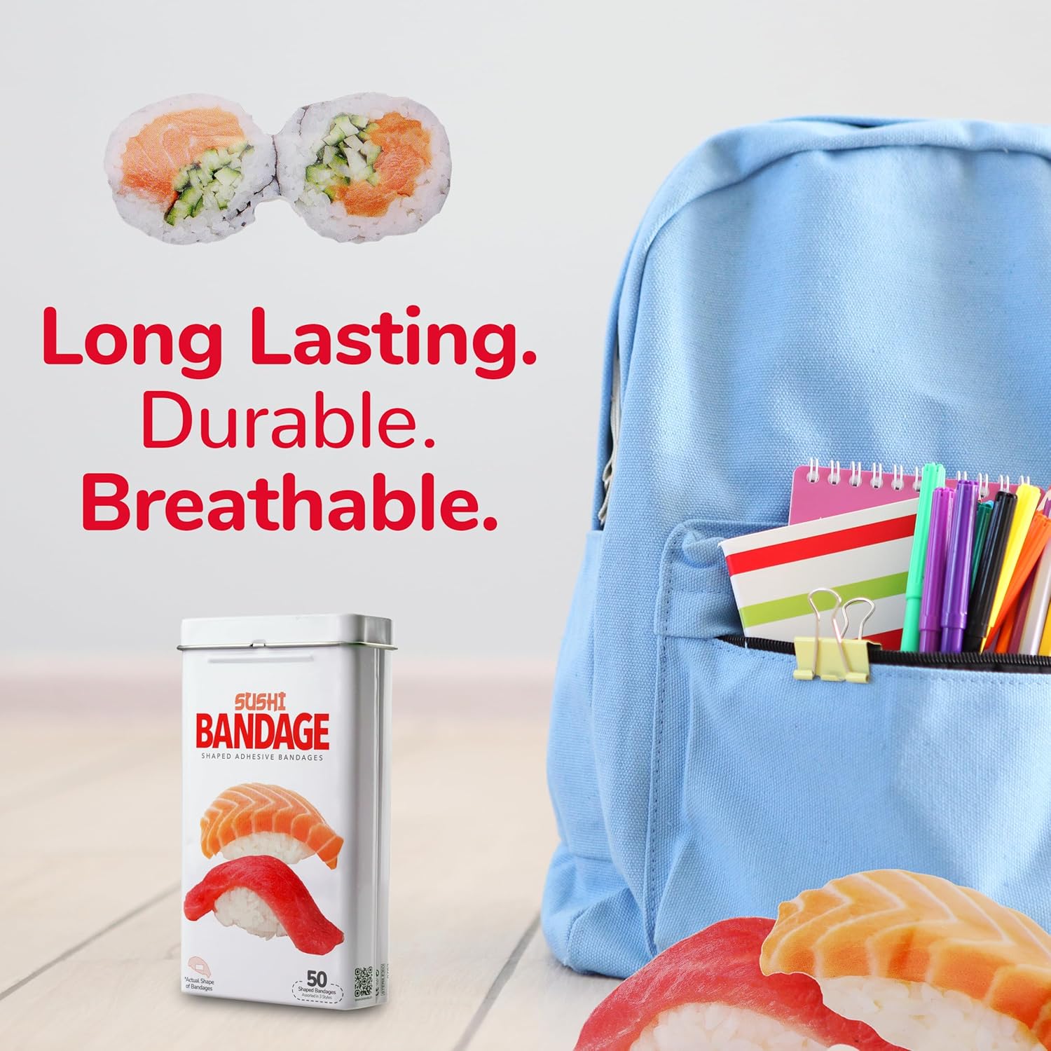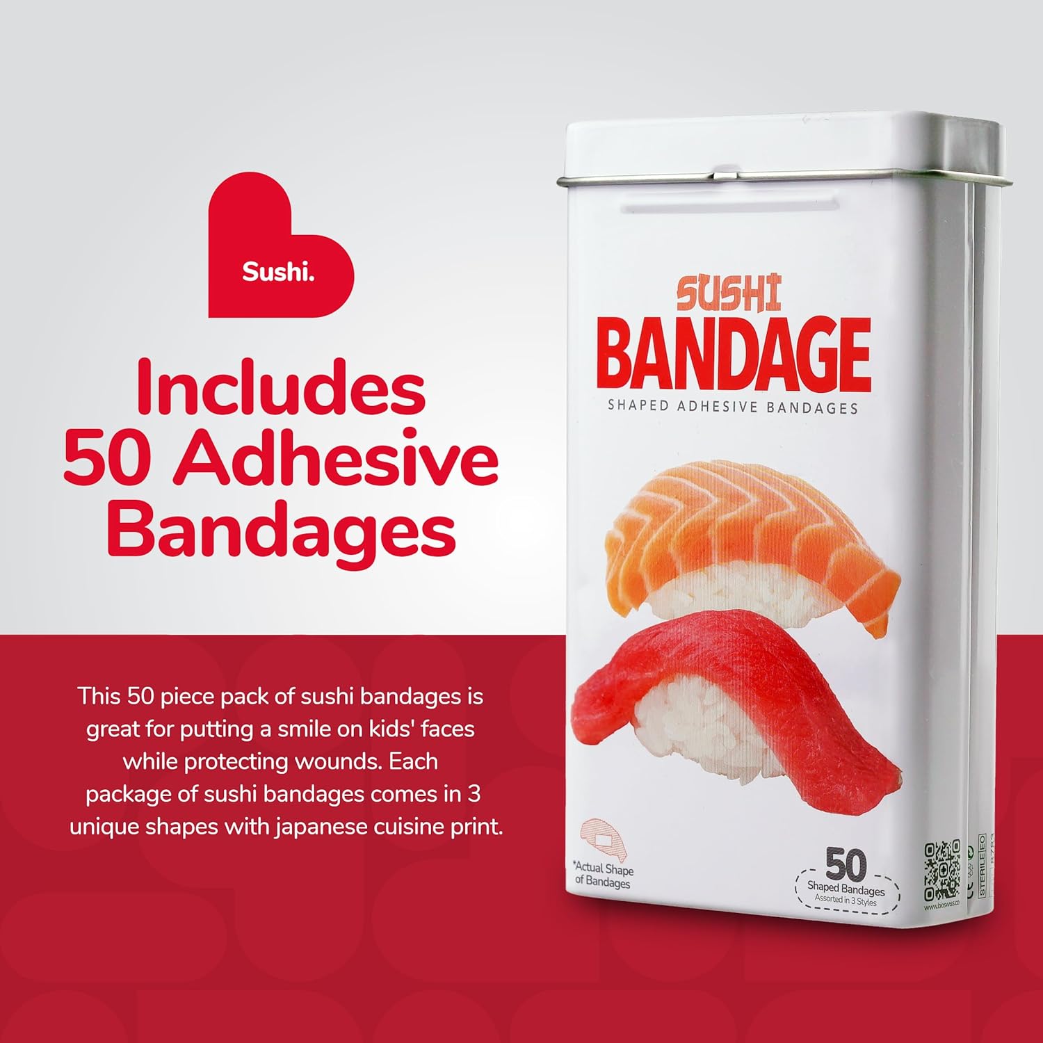 - SUSHI BANDAGES: This 50 piece tin of adorable and delicious looking sushi bandages is great for putting a smile on kids' faces while protecting wounds such as cuts, scrapes, and burns; sticky bandages are perfect for kids and adults alike, and also for school nurses and pediatric doctors