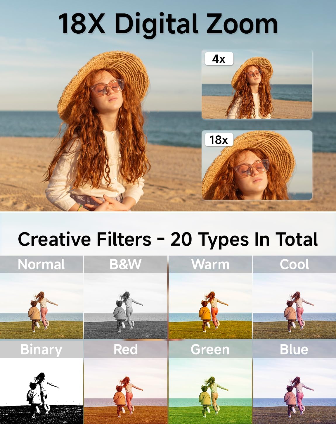 - 18x Digital Zoom & 20 Creative Filters: The digital camera for travel offers an enhanced 18x digital zoom, allowing you to capture distant subjects clearly and in great detail. With 20 diverse filters, including vintage, Y2K, and old school styles. This digital camera is truly the first camera for begginers, ideal for those who like retro styles and y2k aesthetics.